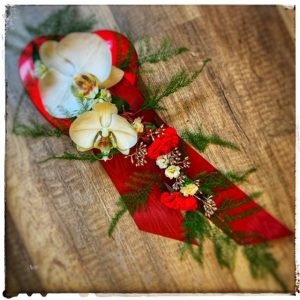 Kaunis koriste interfloran sydänsuklaa rasiaan. Asetelmassa orkidean kukintoja, morsiusharsoa, punaisia oksaneilikan kukintoja ja vihreä unelman oksa. Kukat vaihtelevat kauden mukaan.